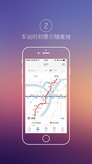 【出行指引】通過選擇起點(diǎn)終點(diǎn)的車站、地標(biāo)建筑,即時(shí)獲得重要旅程資訊,包括票價(jià)、建議線路、預(yù)計(jì)乘車時(shí)間、換乘指示及目的地車站出口建議等;提供車站綜合資訊,包括車站百科、站層圖、站內(nèi)設(shè)施、周邊交通、周邊生活、出口地標(biāo)、站外街區(qū)圖等。