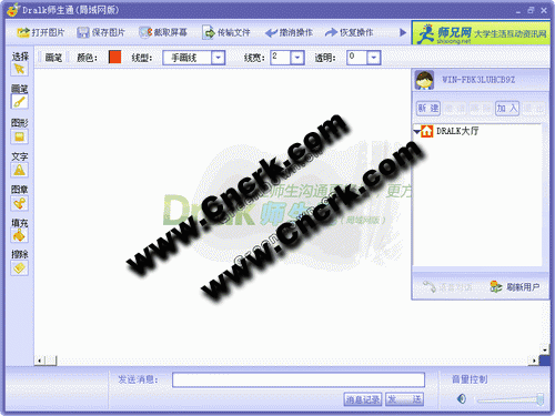 Dralk師生通致力于為廣大在校師生提供一個方便快捷的溝通平臺。該軟件最與眾不同的地方是,您畫的畫,能同時讓所有在線的人都看到,而且是即時的——您的筆觸到哪里,別人就能看到哪里。您可以將您要討論的設(shè)計圖紙、代碼、模型圖、甚至你的文章,通過拷屏的形式,拷入到您的畫板中,所有其它人也同時在自己的畫板中看到您拷屏的內(nèi)容。這樣,所有人戴上耳機,拿起鼠標(biāo),就可以一起討論您所提供的方案