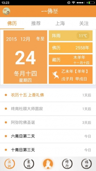 一佛歷整合所有與佛教相關(guān)的節(jié)日及活動信息,是集成了日歷、資訊、社交和綜合服務(wù)等眾多功能的一站式佛教互聯(lián)網(wǎng)平臺。一佛歷旨在傳播和弘揚正信佛教文化,為廣大寺院和法師群體及佛教信眾提供及時、專業(yè)、便捷的服務(wù)。