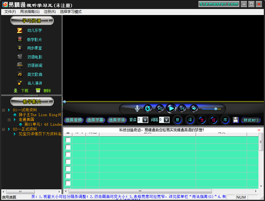 易精通視聽英語學(xué)習(xí)軟件(小學(xué)版)是一款小學(xué)生超級視聽英語學(xué)習(xí)軟件,母語式、沉浸式、情景式教學(xué)。具影音播放、復(fù)讀、點讀、錄音、詞典功能。可“指詞即譯”√重點,標生詞,加注釋,保存學(xué)習(xí)筆記,做聽寫練習(xí),角色扮演,調(diào)字體、字號、字色,學(xué)習(xí)資料:音標速成、語法講解、課文和單詞、新概念英語、迪士尼動畫片、名人演講、英文歌曲。升初后,可增初中資料,兼容金山詞霸、有道詞典和靈格斯詞霸3大詞典,鼠標一指即知詞義、讀音、圖解、詞根和詞綴,操作簡捷,能輕松高效地練聽力、學(xué)口語、背單詞,軟件采用護眼色,不傷眼。