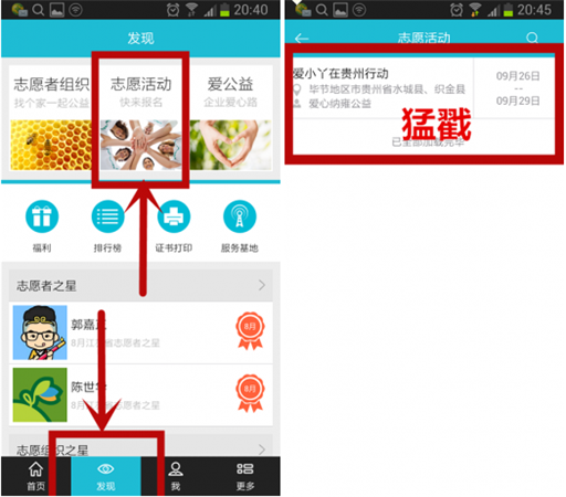 所有報(bào)名參加的活動(dòng),可以通過(guò)照片進(jìn)行記錄,同時(shí)志愿者打卡器APP也提供各種分享功能。