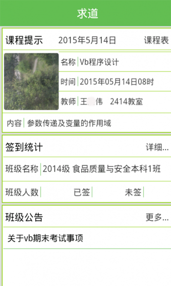 求道是專門為高校、職業(yè)院校、中專技校等學(xué)校的師生量身制作的一款手機(jī)互動交流應(yīng)用,這款軟件具有課程表、簽到考勤、在線測試、課堂監(jiān)控、成績分析等特色功能,從而杜絕教室手機(jī)泛濫,還原最真實的課堂。