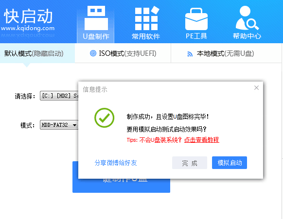直到彈出u盤(pán)制作成功信息提示,點(diǎn)擊“完成”即可,如下圖所示: