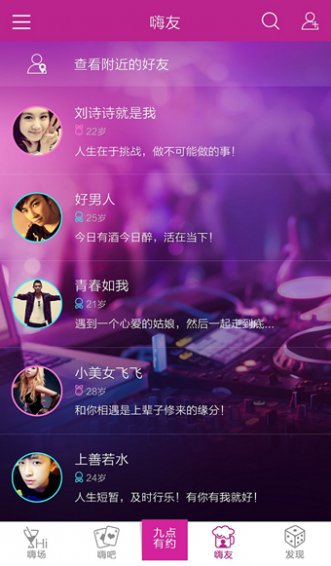 在夜嗨,您可以向周邊的夜嗨族發(fā)出約會邀請,有緣人即來參加;您也可以尋找正在進(jìn)行的夜嗨活動,隨時(shí)加入他們!