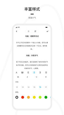 - 功能齊全的富文本日記,支持對齊、加粗、任意文本顏色、大寫設(shè)置等,支持圖文混排,每篇日記高達(dá)30張圖片