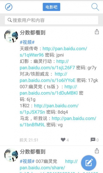 電影吧,視頻資源分享社區(qū),網(wǎng)盤(云盤)社區(qū)。在這里,你可以查看別人分享的最新資源,也可以發(fā)帖求資源,加好友,形成朋友圈。支持文字、圖片、表情,帖子收藏,豐富的消息系統(tǒng),可以點贊,收藏,評論。帖子自動識別帖子中的鏈接,點擊直接打開資源網(wǎng)頁。