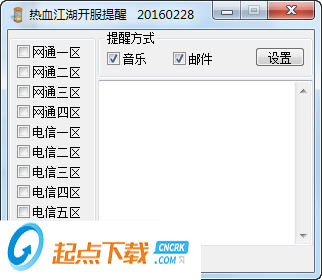 熱血江湖開服提醒工具是一款專為熱血江湖玩家打造的游戲開服提醒工具,這款軟件不僅提供開服音樂(lè)提醒功能,玩家還可以設(shè)置郵箱地址后可以發(fā)送開服提醒到您的郵箱,郵箱如果是移動(dòng)/聯(lián)通/電信的手機(jī)郵箱就會(huì)有短信提示。