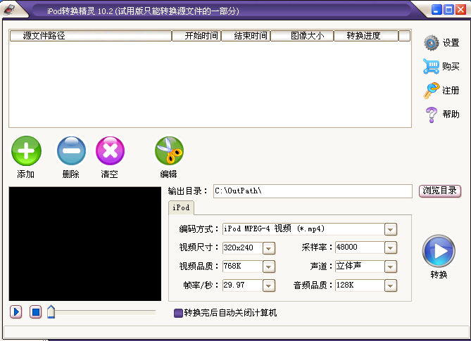 一款iPod所支持視頻格式轉(zhuǎn)換工具,支持幾乎所有的視頻格式轉(zhuǎn)換為蘋果iPod所支持的MP4視頻格式。【軟件特點】