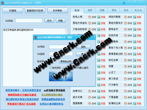 qq空間免費美化克隆器,可以瞬間將別人漂亮的qq空間裝扮克隆到自己的空間!通過克隆空間讓您的 qq空間變得更加絢麗!由我們開發(fā)的QQ空間美化克隆器可以快速準(zhǔn)確免費的裝備QQ空間,并且裝扮不需要任何技術(shù)和困難, 軟件只是傻瓜式操作即可! 軟件特點: 1.登陸您的QQ空間 2.填寫準(zhǔn)備克隆的QQ空間號,然后一鍵克隆。 3.打開你的空間看看吧,就這么簡單! 4.智能克隆模式,只需三步即可完成...軟件初次運行會提示是否修改主頁,請用戶注意選擇!