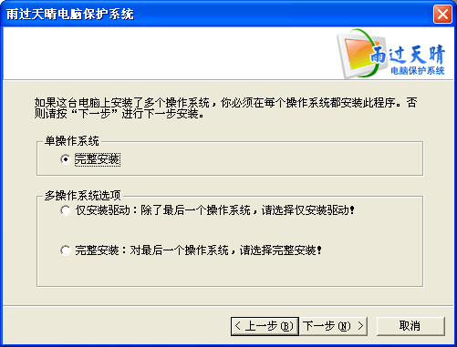 1、在安裝“雨過天晴”時(shí),默認(rèn)安裝方式是保護(hù)所有分區(qū),也就是說對整個(gè)硬盤的數(shù)據(jù)進(jìn)行保護(hù)。建議您選擇自定義安裝,或者安裝完成后調(diào)整需要保護(hù)的分區(qū),最好只保護(hù)C盤。如果保護(hù)所有分區(qū),進(jìn)行還原后,會(huì)還原所有硬盤上的數(shù)據(jù),造成您的數(shù)據(jù)丟失。