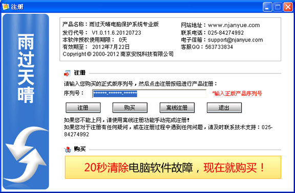 軟件注冊1.雨過天晴專業(yè)版可以免費(fèi)使用三個(gè)月,如果過期,請與本公司及各地代理商聯(lián)系購買正式版軟件序列號(hào),只有購買了正式版后才能注冊成功繼續(xù)使用。