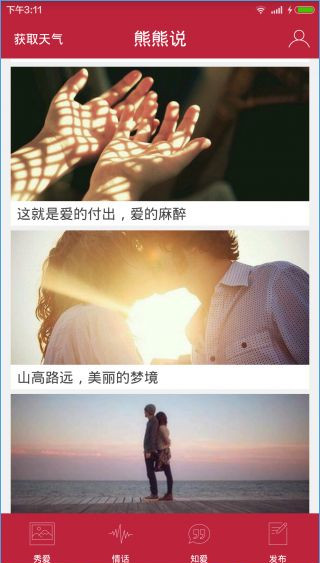 熊熊說(shuō)app是一款可以無(wú)限分享的移動(dòng)應(yīng)用,用戶可以把自己的幸福曬給熊熊,把你的情話說(shuō)給熊熊聽(tīng),把你的小困惑也可告訴熊熊,熊熊幫你解答哦。熊熊是你的好朋友,你也可以和他分享你的小秘密。【軟件特點(diǎn)】