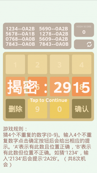 “趣味猜數(shù)字”是一款趣味的小游戲,畫面簡潔,玩法簡單。此游戲操作方便,通過觸摸、滑動(dòng)兩種操作即可游戲,即開即玩,擁有超高的用戶體驗(yàn),在游戲過程中體驗(yàn)前所未有的樂趣。游戲規(guī)則:您每猜一個(gè)數(shù)字,游戲就要根據(jù)這個(gè)數(shù)字給出幾幾,其中前面的數(shù)字表示位置正確的數(shù)的個(gè)數(shù),而前的數(shù)字表示數(shù)字正確而位置不對的數(shù)的個(gè)數(shù)。最終在8次之內(nèi)猜出數(shù)字即可獲勝。