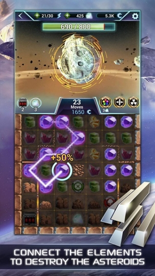 《紀元2205: 小行星礦工(ANNO 2205 Asteroid Miner)》是一款趣味十足的三消游戲,玩家只要在場上布滿寶石的地方,將相同寶石連成一線,便能夠消除。游戲每一關(guān)都設(shè)置了不同任務(wù),包括收集特定數(shù)量的寶石,擊破正在撞過來的隕石等。玩家需要在限定回合數(shù)內(nèi)完成任務(wù),否則便會輸?shù)?。玩家在任?wù)中獲得的資源能夠用來開發(fā)太空站,獲得特殊能力。