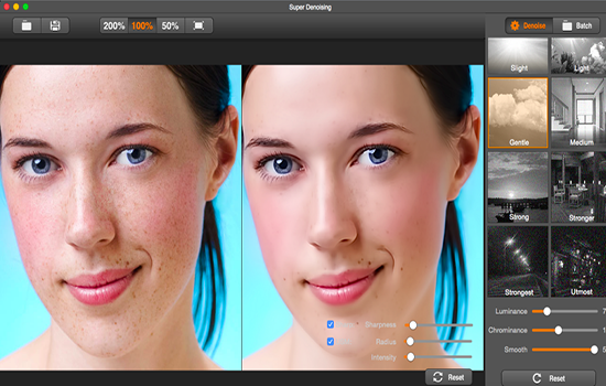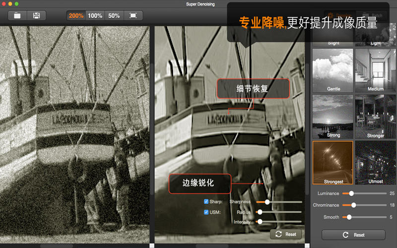 超級去噪Mac版使用最新的圖像去噪算法,有效處理低光下信噪比很低,噪聲很強的照片,非常適合處理曝光不足而產(chǎn)生大量噪波的數(shù)碼照片。尤其是對于在夜景低光下成像的高 ISO 噪聲非常明顯,數(shù)碼相機、智能手機(iPad, iPhone,Android手機等)、單反相機拍的照片均適用。同時,超級去噪Mac版支持更好地修復(fù)像素細節(jié),可以直接對 RAW 格式照片進行降噪處理。支持噪點圖批量處理和一鍵修復(fù)燥點。