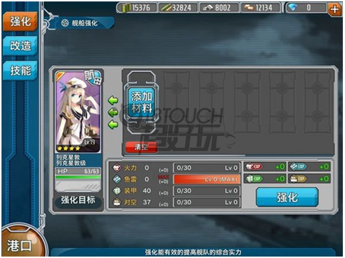 所謂強(qiáng)化,就是通過喂狗糧,提高戰(zhàn)艦的屬性,可以提高的屬性包括火力、魚雷、裝甲和對(duì)空。對(duì)于驅(qū)逐艦來說,魚雷屬性是最重要的,畢竟,主要輸出就是靠魚雷的!好在前期我們能撈到的基本也都是驅(qū)逐艦,強(qiáng)化起來,屬性長的非???。(戰(zhàn)艦少女狗WIKI有詳細(xì)糧強(qiáng)化分析一覽或查看戰(zhàn)艦?zāi)夸浿懈鲬?zhàn)艦的狗糧口感。)