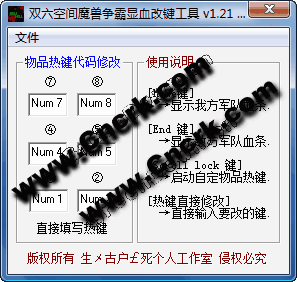 功能介紹: 1.顯示敵方血條. 2.顯示友方血條. 3.物品然熱鍵修改. 提供物品欄的熱鍵修改及游戲中血條的顯示,以便更好的操作游戲!