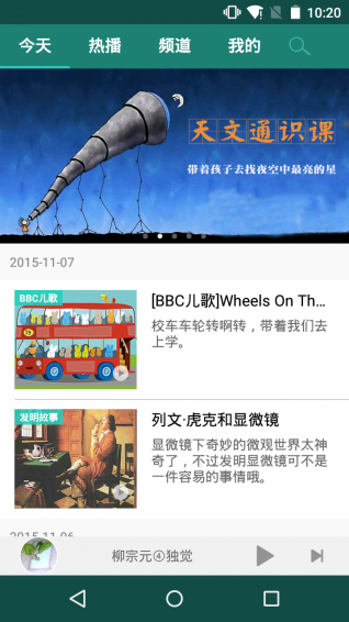 【頻道】該部分是經(jīng)過整理的分類專輯,分為:繪本、文學(xué)、英語、兒歌、歷史等多個(gè)頻道。