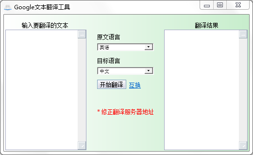 Google文本翻譯工具是一款小巧、快速、準(zhǔn)確的即時(shí)翻譯工具,無需安裝、體積小、低內(nèi)存占用、綠色使用??稍趲资N語言之間互相轉(zhuǎn)換,是基于Google翻譯制作的軟件。程序采用Google強(qiáng)勁的在線實(shí)時(shí)翻譯技術(shù),可以讓您在全世界40多種語言之間互相翻譯。支持的語言有:中文、英語、日語、韓語、法語、德語、俄語、意大利語、葡萄牙語、阿拉伯文、加泰羅尼亞語等42種