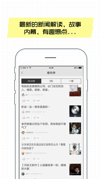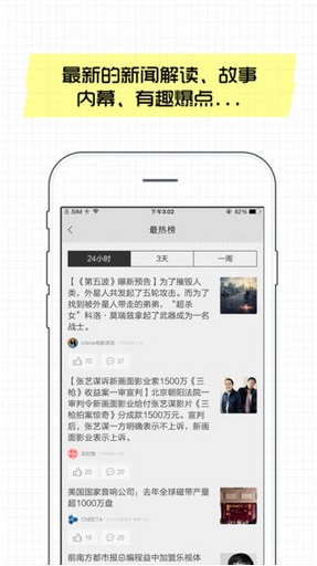 1、在早上起床后,晚上睡覺前瀏覽抽屜新熱榜,了解剛剛發(fā)生的熱門有趣事件;2、發(fā)生了大事件,上抽屜新熱榜看最新的新聞解讀,故事內(nèi)幕,有趣爆點和用戶吐槽;