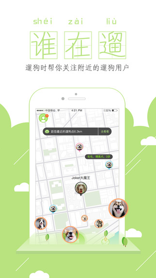 附近狗狗:實時顯示附近正在遛的狗狗,幫您的狗狗找到合適的小伙伴。