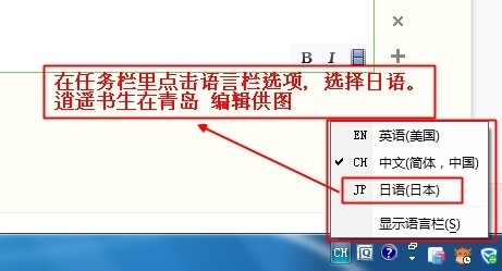 在電腦桌面下端的任務欄里,選擇輸入法選擇欄,選擇“日語”。