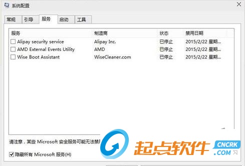 4.在“服務”選項卡上,選中“隱藏所有 Microsoft 服務”復選框,然后清除列表中剩余的所有服務的復選框