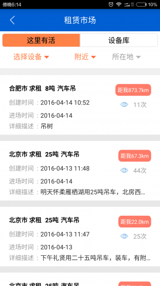 e家機(jī)械app上有豐富的求租信息,機(jī)主可以根據(jù)距離就近選擇,并且直接在線交易;