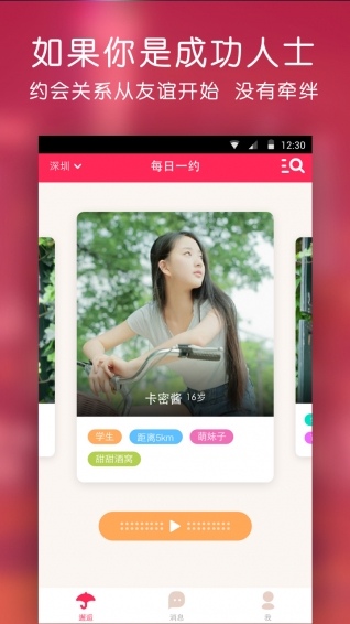 【如果您是成功人士】您有機(jī)會(huì)在社區(qū)輕易結(jié)識(shí)成千上萬的魅力女生。約會(huì)關(guān)系可以從友誼開始,沒有牽絆。隨時(shí)隨地與你喜歡的妹子約會(huì)戀愛。審核通過女生平均年齡18-28.她們的職業(yè)大多是學(xué)生,模特,白領(lǐng)。有較好的身材,美麗的面容。【如果您是魅力女生】您可以找到成功人士,大叔,歐巴。獲得他的關(guān)照,度過人生囧境。他歷經(jīng)商海、職場(chǎng),他成熟,穩(wěn)重,他與你分享人生經(jīng)驗(yàn),成為你的人生導(dǎo)師他帶你購物、帶你吃昂貴的晚餐,帶你去異域旅行,享受寵愛從遇見甜心開始。他會(huì)用你所需要的方式去疼你,愛你。注冊(cè)審核通過男士,年薪超過50萬,身價(jià)超過千萬