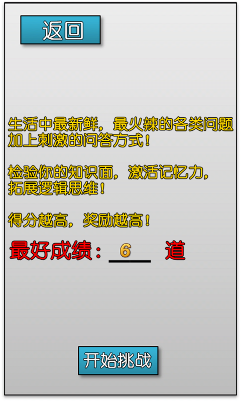 1.游戲分為3中模式:升學(xué)、挑戰(zhàn)、百科!2.1000多個知識性,趣味性俱佳的問題!