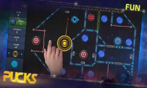 《太空冰球SpacePucksGame》是一款非??简?yàn)?zāi)銚羟蛄Χ群头较虻男蓍e娛樂游戲。游戲中你需要將冰球發(fā)射到屏幕中各個(gè)不同的指定位置,在霓虹閃耀的太空中,避開致命的障礙物,用最少的擊球數(shù),完成每關(guān)的任務(wù)吧!