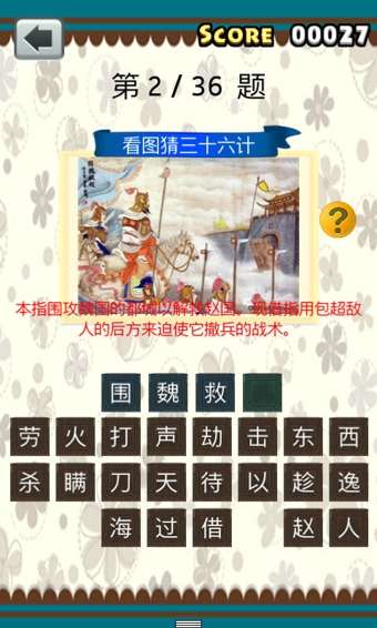 本游戲收錄了三十六計(jì)的全部圖解及解釋,快來猜猜看,看你是不是三十六計(jì)達(dá)人。