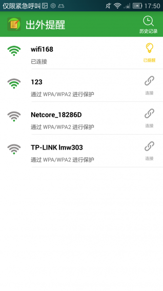出外提醒a(bǔ)pp是一個很好用的提醒軟件。這個出外提醒a(bǔ)pp是專為那些馬大哈們推出的,是不是總是出門忘記帶東西?來試一試這個出外提醒a(bǔ)pp吧!這個出外提醒回來WiFi斷開的時候自動提醒用戶。