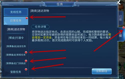 每日必做/經(jīng)驗活動:一條龍〉師門任務〉寶圖任務〉劇情重溫〉門派挑戰(zhàn)。