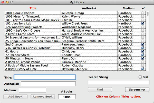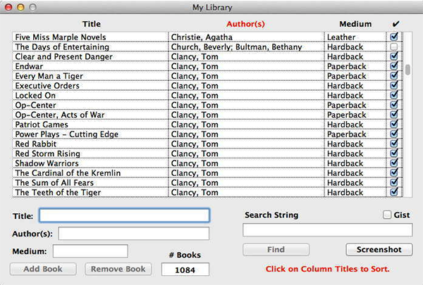 MyLibraryMac版幫助用戶管理的書籍他們的圖書館。保存每本書的數(shù)據(jù)是標(biāo)題,作者(S),中(精裝本,平裝本,電子書等),如果這本書已經(jīng)被閱讀或沒有,這本書很短的要點(diǎn)。用戶界面提供簡單的數(shù)據(jù)錄入,搜索字符串,并通過標(biāo)題,作者,媒體,或讀狀態(tài)排序。