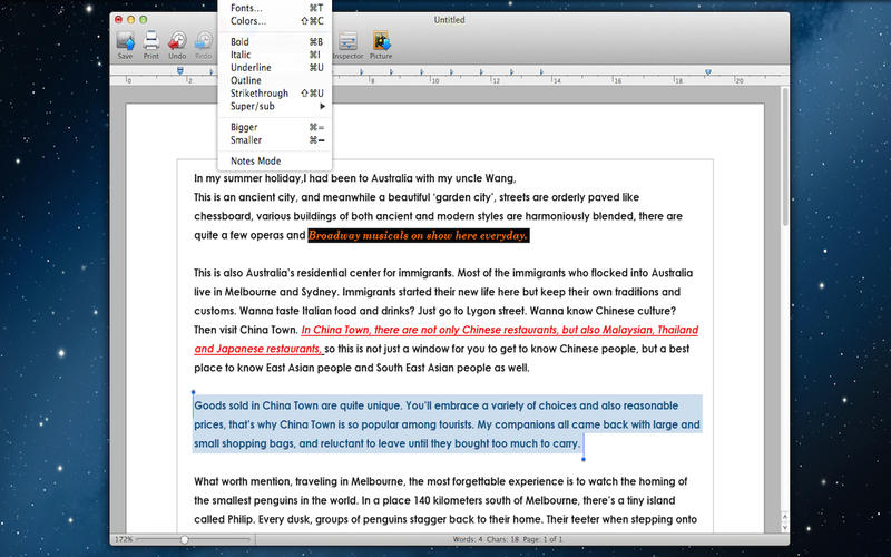 Go Word Mac版是 Mac 上的一款文字處理軟件,我們的獨(dú)家樣式表視圖創(chuàng)建外觀精美的文檔很快。我們先進(jìn)的文檔,但易于使用的工具,包括我們強(qiáng)大的發(fā)現(xiàn)(包括正則表達(dá)式),或添加形狀和標(biāo)注使用畫圖工具。使用跟蹤更改和評論,兼容微軟Office的人合作。你可以寫在OS X操作系統(tǒng)支持的任何語言(包括從右到左的語言)由于多語種支持建立。【軟件特色】