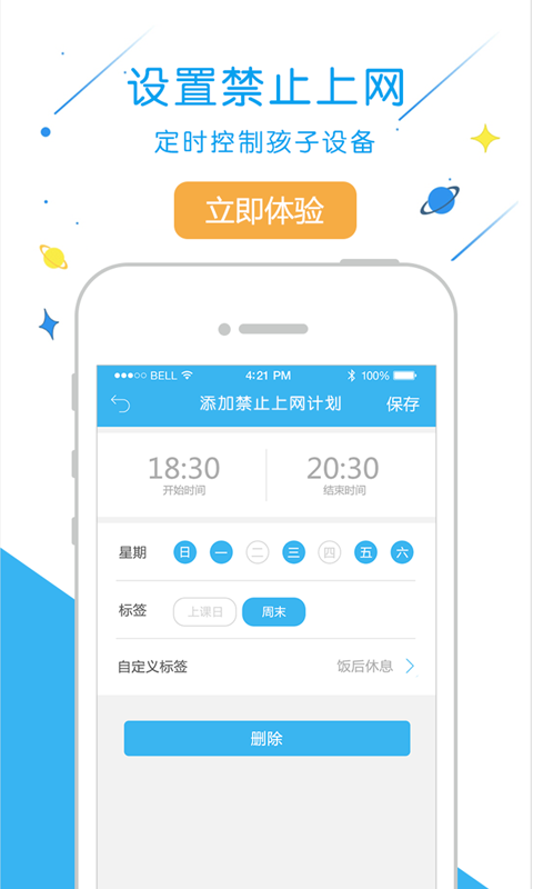 禁止上網(wǎng)計劃:可自由設(shè)置孩子端手機上網(wǎng)時長,超過時間孩子手機即自動鎖屏。