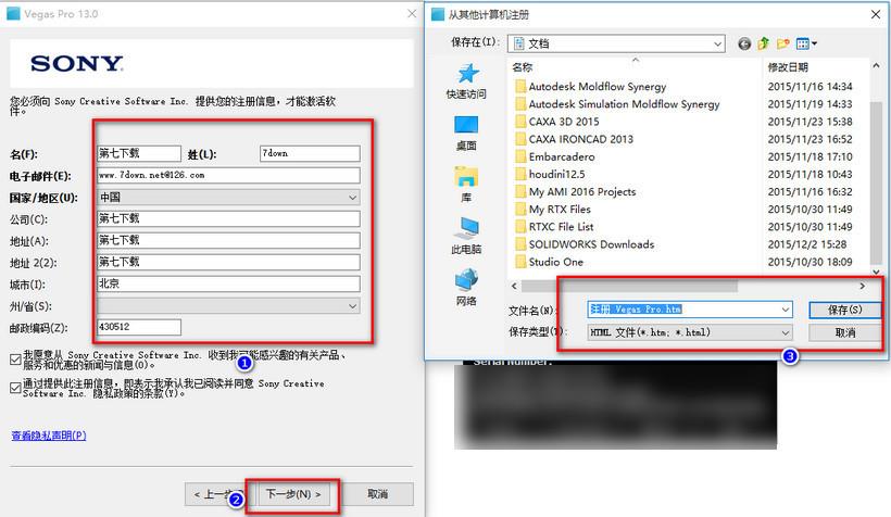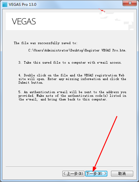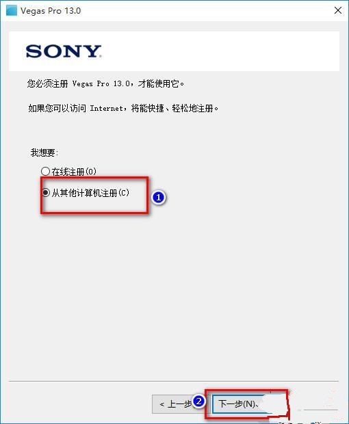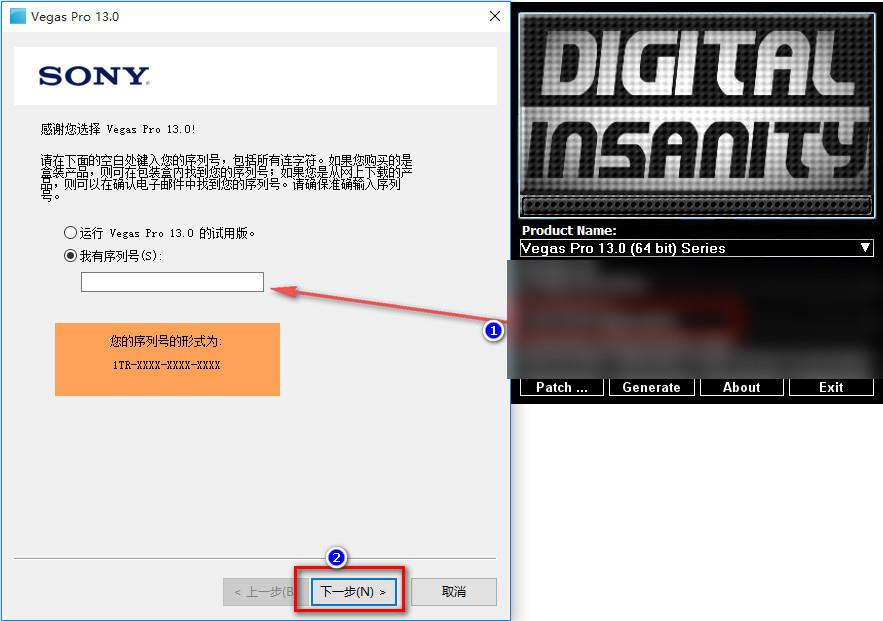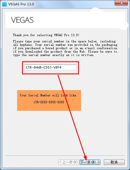 第二步:關(guān)閉提示窗口,注意注冊機(jī)暫時(shí)不要關(guān)閉,后面還要用到它,接著我們雙擊桌面的主程序快捷方式【Vegas Pro 13.0 (64-bit)】,在彈出的注冊界面中輸入:【1TR-8KY6-3ZPC-2X75】,點(diǎn)擊【下一步】按鈕。