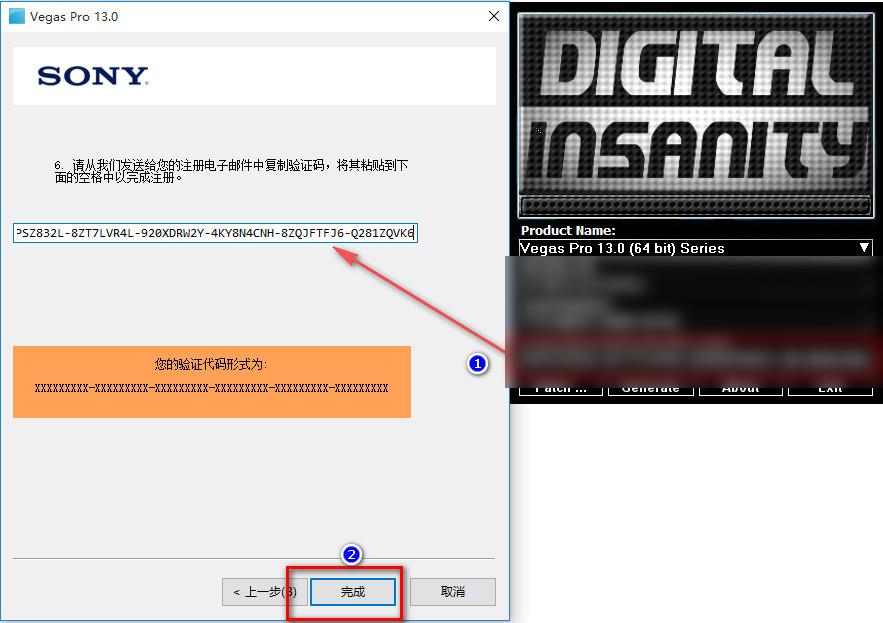 第七步:接下來會(huì)彈出激活碼填寫文本框,大家只需從Sony Vegas Pro 13 注冊機(jī)中復(fù)制激活碼粘貼到這里,并點(diǎn)擊【完成】按鈕。