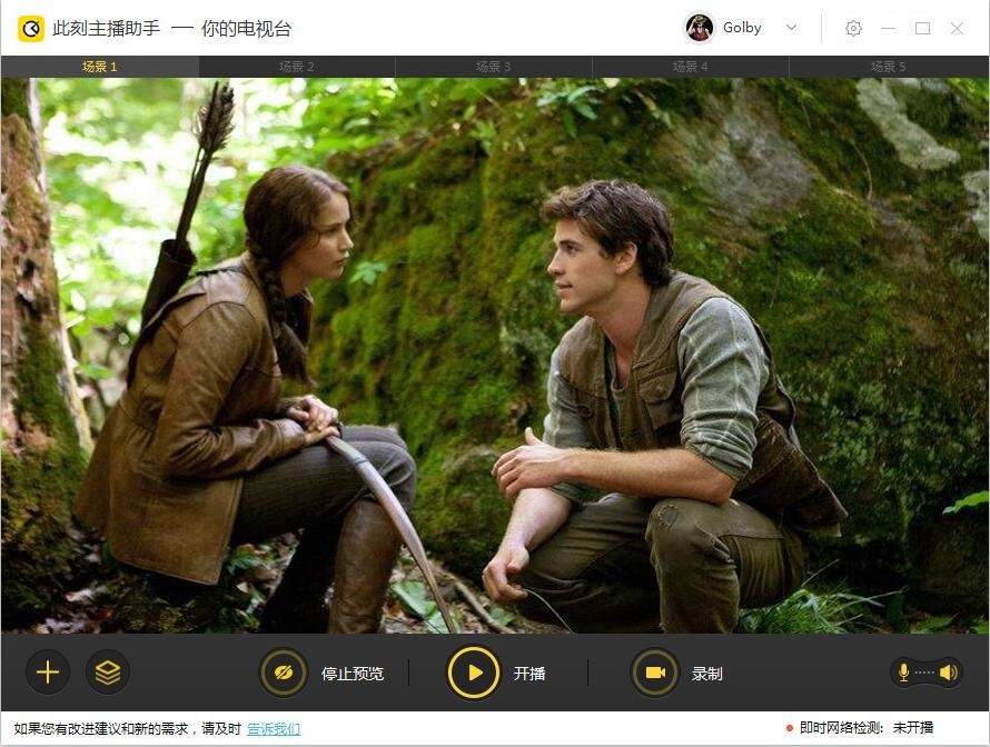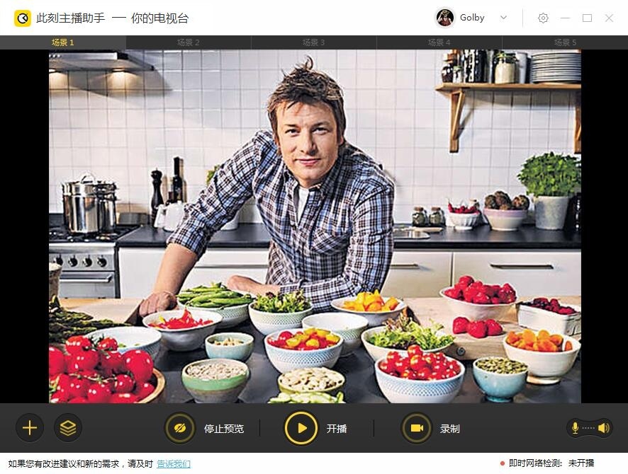 位于主界面中間下方,在編輯好直播場景后,就可以使用主播按鈕開啟并操控整個直播過程了,