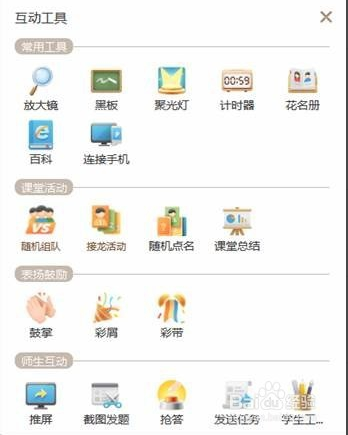 對(duì)于低年齡段的學(xué)生來說,聚光燈、放大鏡等工具可以幫助聚焦學(xué)生注意力;點(diǎn)贊、送花等工具可以激發(fā)學(xué)生的學(xué)習(xí)興趣;還有隨機(jī)點(diǎn)名、接龍活動(dòng)、團(tuán)隊(duì)競賽等工具,可以幫助教師開展課堂活動(dòng),活躍課堂氣氛。