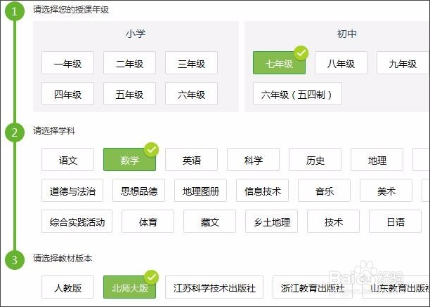 年級(jí)、學(xué)科和版本分別選擇:7年級(jí)、數(shù)學(xué)、北師大版本,進(jìn)入下一步。