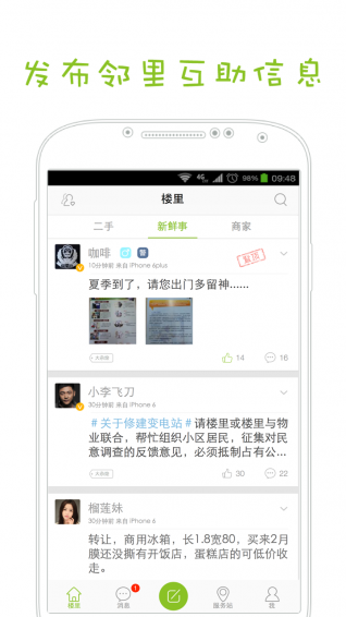 在樓里,人人都是社區(qū)記者,爆料社區(qū)新聞,曝光無(wú)良商家,幫助鄰居解答疑問(wèn),轉(zhuǎn)讓閑置舊物,都可以讓你的社區(qū)影響力爆棚~