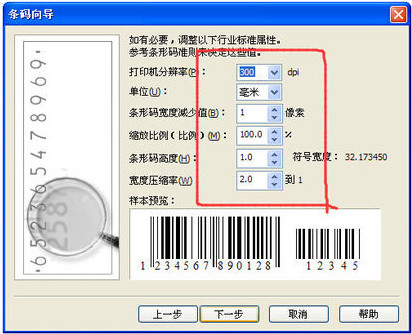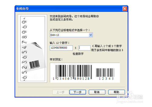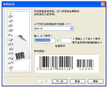 第二,緊接上一步之后,彈出條形碼設(shè)置框。在設(shè)置框中設(shè)置參數(shù):在“從下列行業(yè)標(biāo)準(zhǔn)格式中選擇一個(gè)”參數(shù)項(xiàng)里選擇EAN-13(中國(guó)通用格式) 。然后點(diǎn)擊“下一步” 如圖