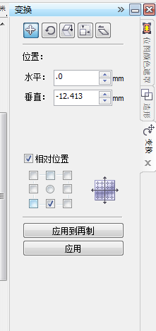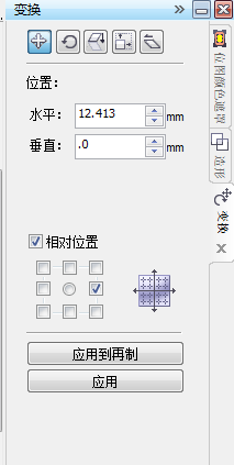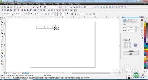 然后在右邊的變換工作窗下,相對(duì)位置打上勾,如圖所示。然后點(diǎn)應(yīng)用到再制,我們可以發(fā)現(xiàn)原來(lái)網(wǎng)格的右邊出現(xiàn)了一樣的正方形。然后我們選上所有的一排小正方形,然后再次應(yīng)用再制。最后全選上,在【排列】->【結(jié)合】