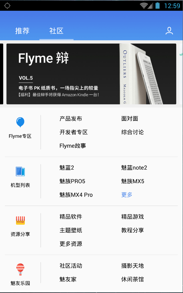 以分區(qū)形式展示社區(qū)包含的所有版塊,包括:Flyme專區(qū)、機型列表、資源分享、魅友樂園。機型區(qū)默認顯示5個熱門機型,其余可以點擊「展開」查看。