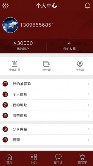 進入“陳茶會”首頁后,可以看到收藏茶、年份茶、野生茶、茶禮、茶具、收茶等六大品類和分類、圈內(nèi)話、購物車、家(個人中心)等四大板塊。其中,在茶品分類中有黑茶、白茶、普洱茶、茶具、茶禮等板塊,用戶只需點擊板塊標(biāo)簽,即可了解產(chǎn)品詳情。此外,合作銷售人員可以進入“個人中心”版塊,直接了解、查詢個人的直銷傭金、獎勵機制等,也可以在茶圈內(nèi)發(fā)表個人評語,與同道茶人互動交流等。