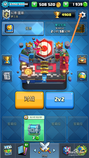 1、首先打開皇室戰(zhàn)爭,然后點擊下圖中箭頭標注的位置。