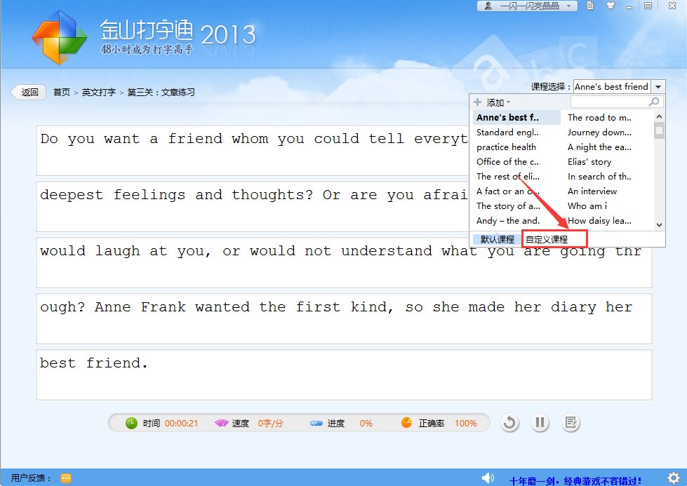 首先,打開金山打字通的英文打字—文章練習后,如圖選擇課程中,點擊自定義課程。