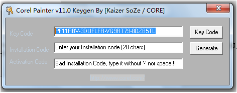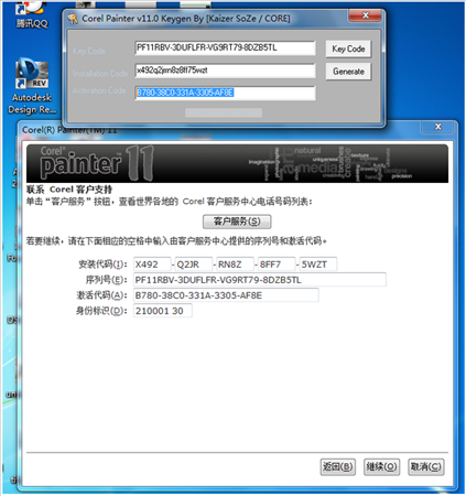 然后裝好后軟件提醒要激活,在激活的界面選中間那個方式,好像是“致電corel”那個(忘記了……),然后就看到一個20chars的Installation code,復(fù)制到注冊機(jī)第二行,然后再generate一下,把生成的第三行激活碼粘貼進(jìn)去就好了